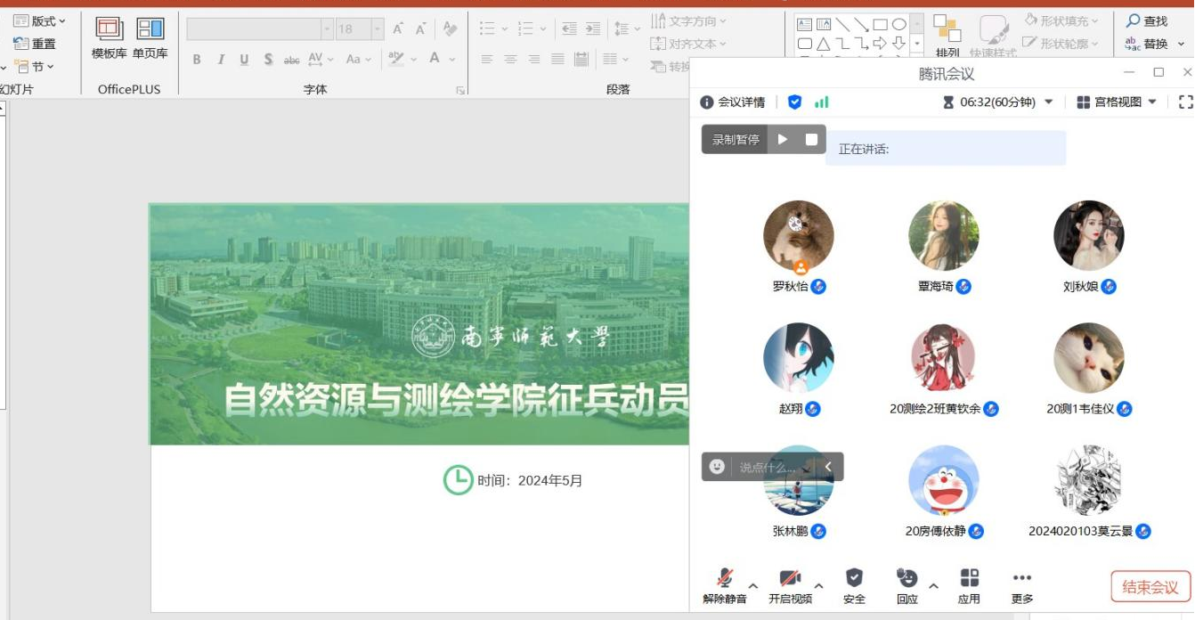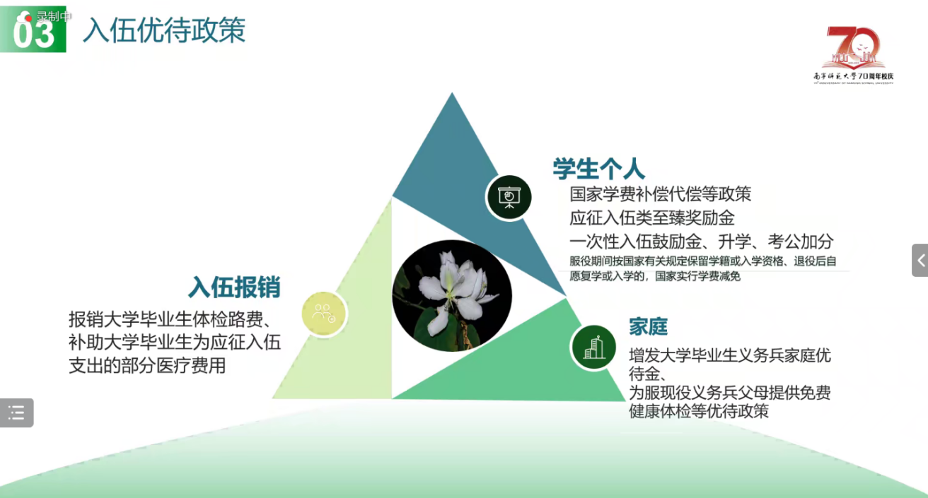 会上,罗秋怡老师指出了国家安全和国防建设的重要性,强调征兵工作是维护国家安全、保障人民幸福的基石。她详细介绍了入伍基本条件、入伍报名流程和大学生入伍优待政策等方面的信息;通过一系列生动的案例和感人至深的故事,展示了当代军人的英勇形象和无私奉献精神。最后,罗老师鼓励广大学子们要抓住机遇,积极报名参军,为祖国的国防事业贡献自己的力量。