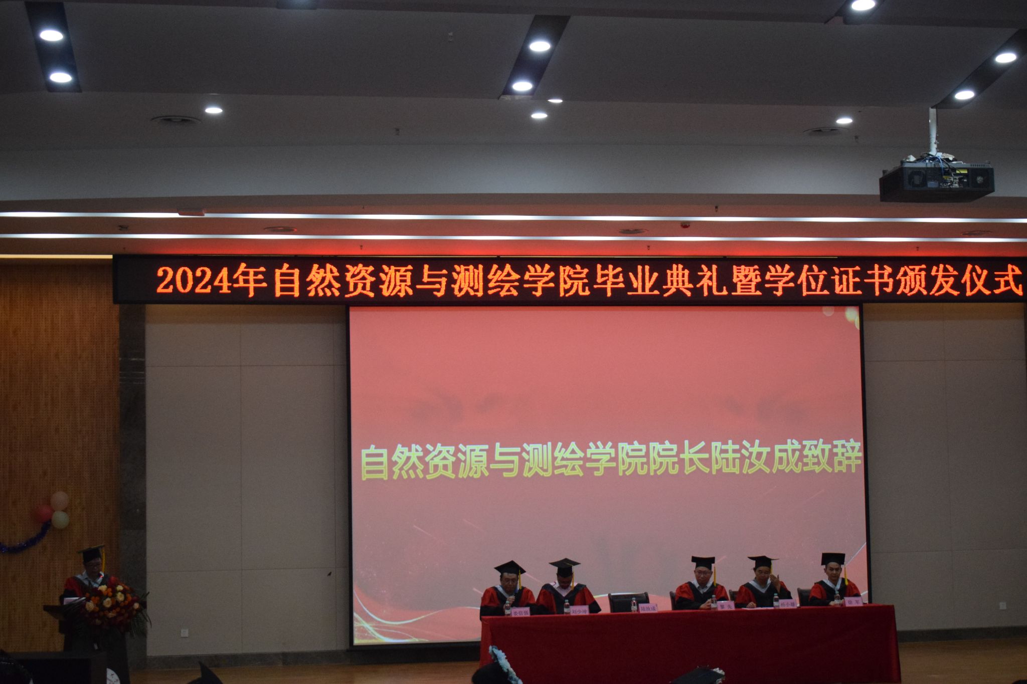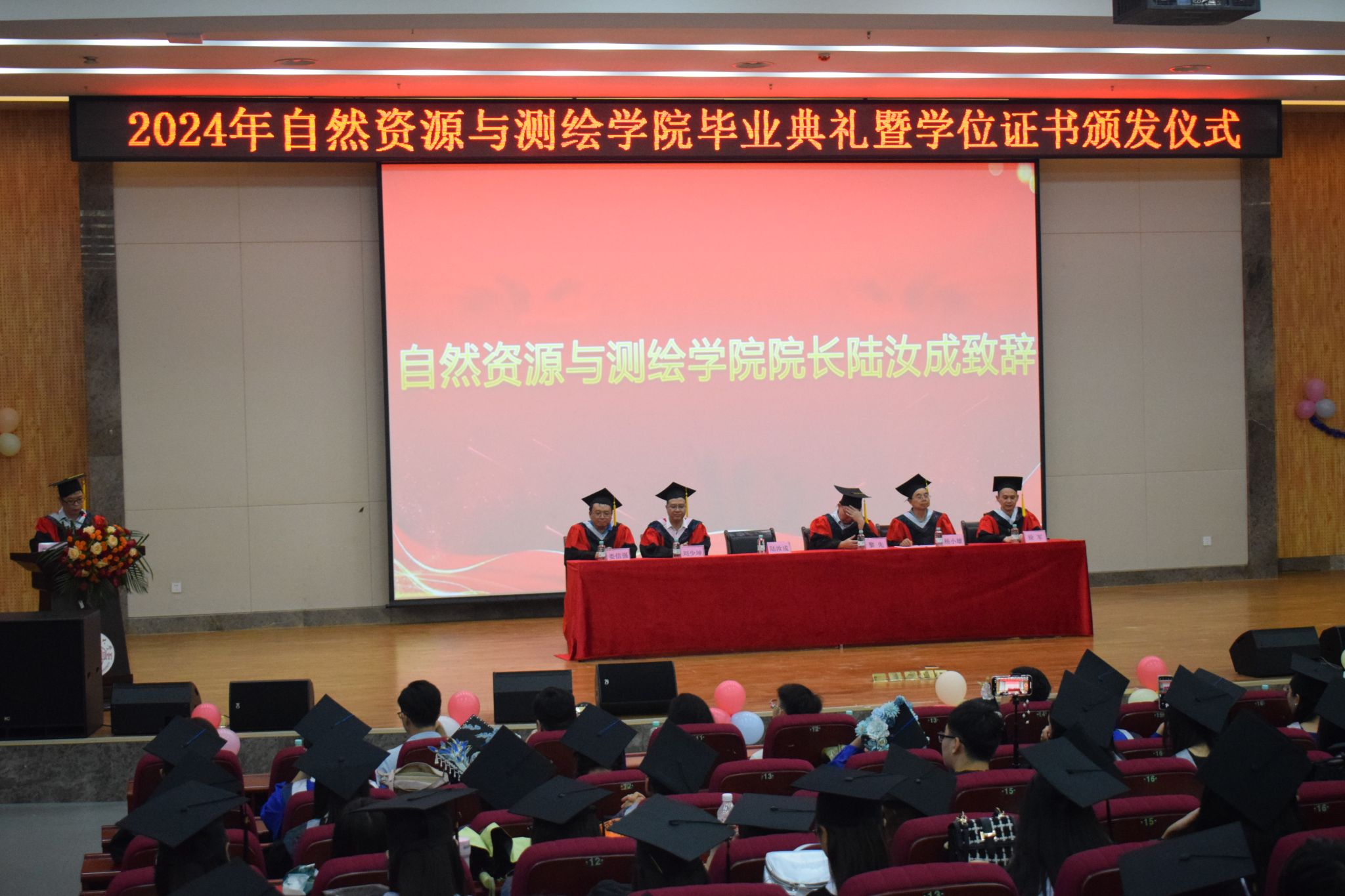 在雄壮的国歌声中,学院2024年毕业典礼暨学位授予仪式正式拉开帷幕。陆汝成院长以《主动应变,做挺膺担当的时代追梦人》为题致辞。他代表学院向2024届全体毕业生表示热烈的祝贺和诚挚的祝福!向悉心教导培育学生成长成才的家长和老师,致以崇高的敬意和衷心的感谢。杨小雄副院长宣读了学校2024届学生毕业及学位授予的有关文件。在主席台就坐的学院领导、学院学位评定委员会委员为全体毕业生颁发毕业证书和学位证书并一一拨穗。在庄严而隆重的氛围中,现场响起热烈的掌声,共同见证毕业生们的重要时刻。