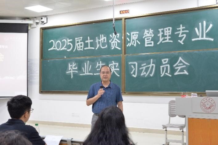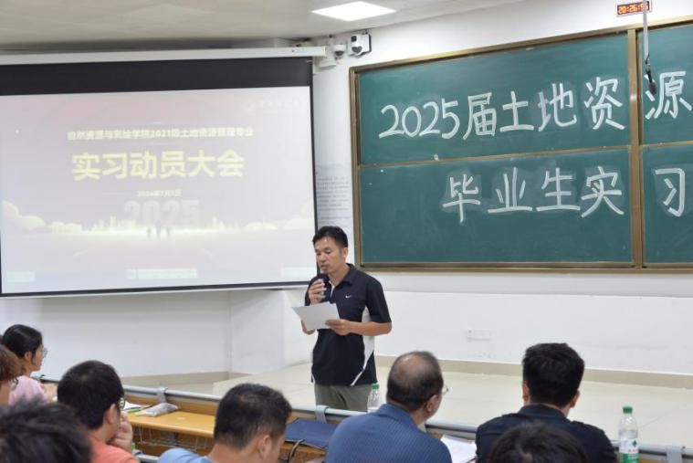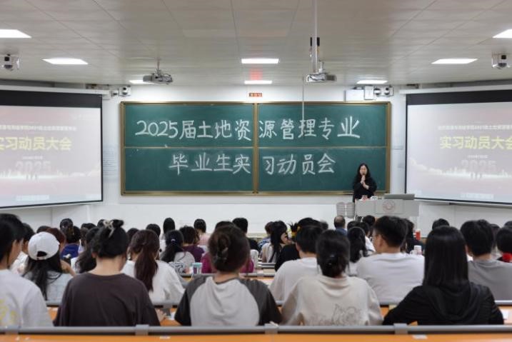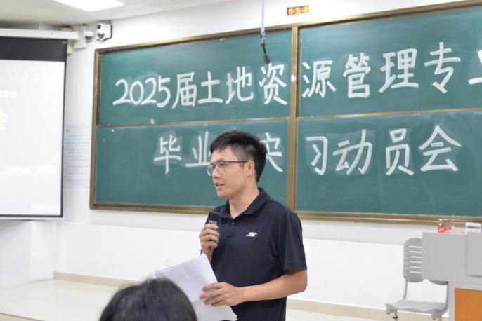 土地资源管理系2025届毕业生实习动员大会在一号教学楼115阶梯教室隆重举行。土管系党支部陆一敢书记、系主任刘少坤老师、副主任张利国老师及欧梦琳老师出席会议,21土管1班、21土管2班级21土管专升本班141名同学参加,共同为即将踏上实习岗位的同学们精心筹备了一场别开生面的实习前动员大会,旨在为同学们搭建起通往职场的坚实桥梁。