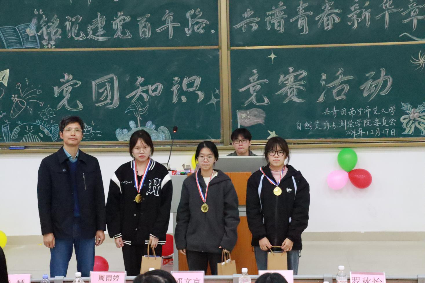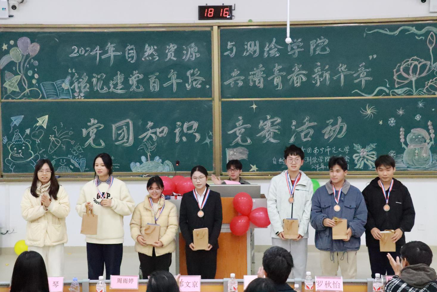 经过数小时的激烈角逐,最终,第七小队荣获冠军,第九小队荣获亚军,第十四、第二小队荣获季军,其他小队获得了优秀奖。他们以深厚的理论基础、敏捷的思维反应和出色的团队配合征服了评委与观众。彭定新老师亲自为获奖队伍颁发荣誉证书和奖品,并作比赛点评。他对选手们的表现给予了高度赞扬。他指出,大家在今后的工作和学习中,应持续深入学习党团知识,汲取前进的智慧和力量,传承红色基因。他强调,广大青年学生应铭记中国共产党自1921年成立以来的光辉历史,积极向党组织靠拢,坚定理想信念,争做有理想、敢担当、能吃苦、肯奋斗的新时代好青年。