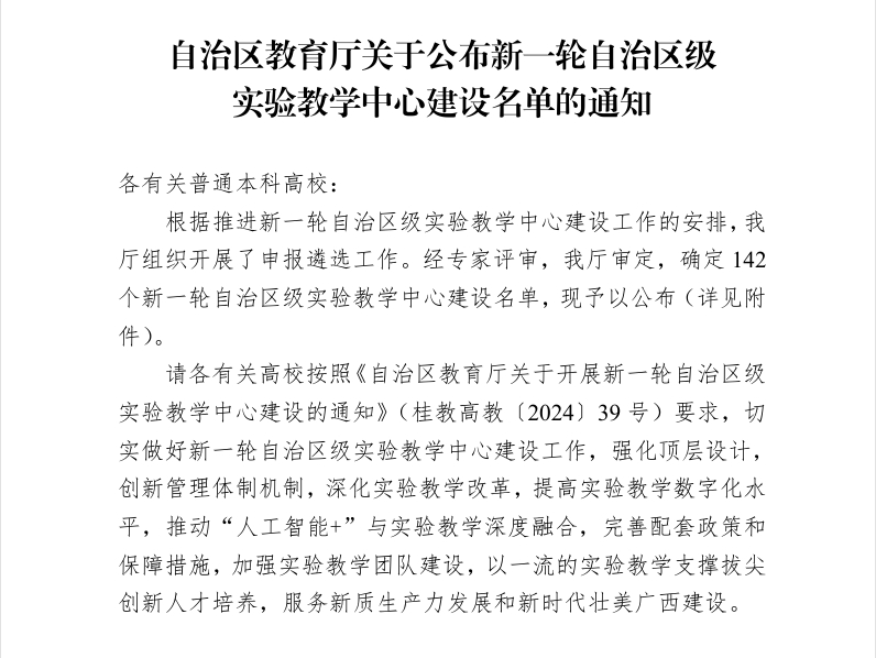 根据《自治区教育厅关于公布新一轮自治区级实验教学中心建设的通知》(桂教高教[2025]6号),经专家评审,自治区教育厅审定,美剧天堂
