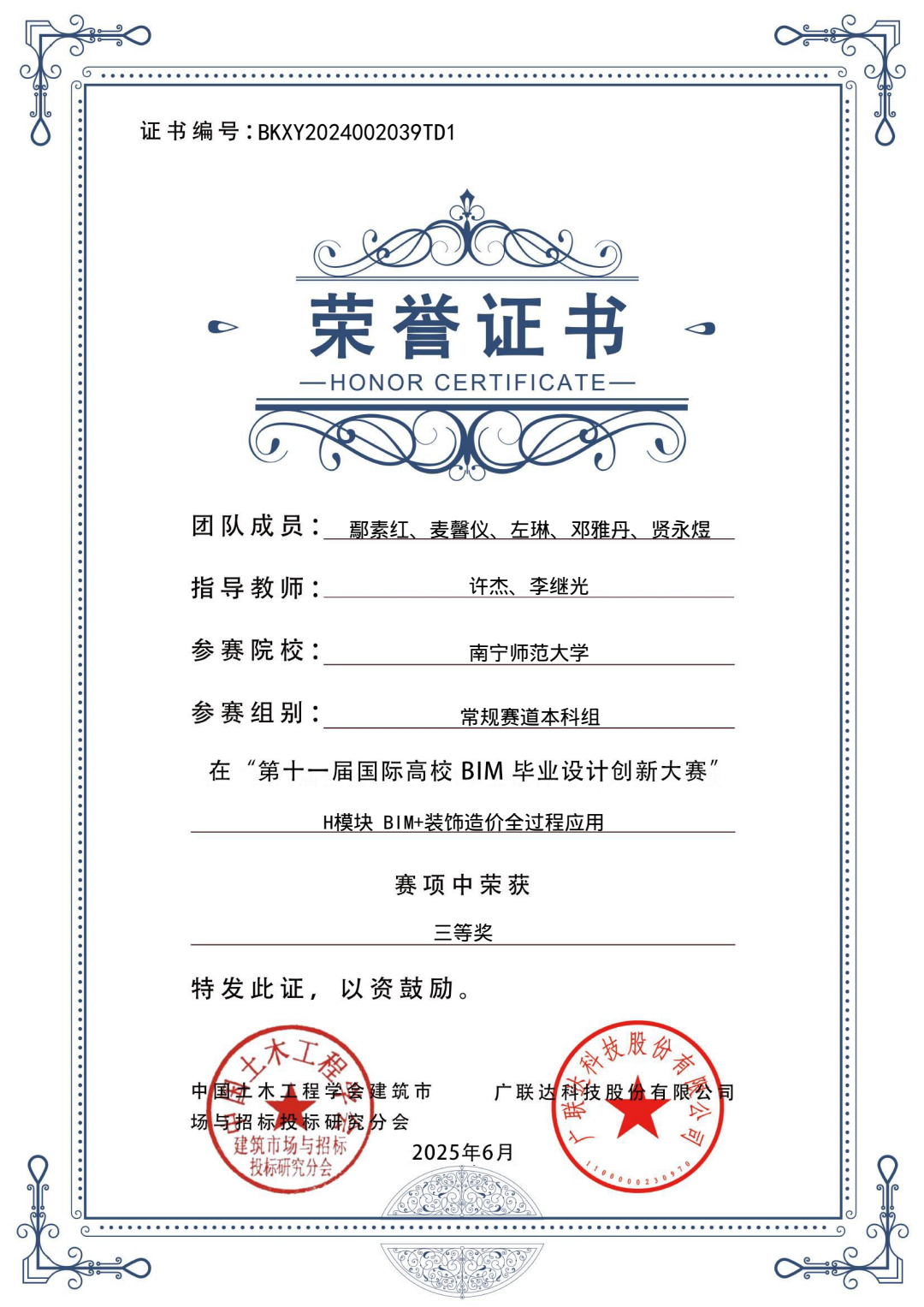 第十一届国际高校BIM毕业设计创新大赛是教育部认证的A类赛事,本次大赛共计报名700余家国内院校,10余家国外院校,14000余支团队,参与师生80000余人,共计提交作品4400余份。学院3支队伍均在此次大赛中表现出色。22级房地产开发与管理专业的陈欣怡、奚经透、谢方冰、黄顺美、宁雪梅等十五位参赛队员利用课余时间仔细研究比赛规则和相关要求,分工明确、各司其职、紧密配合。面对比赛中遇到的困难,他们迎难而上,相互交流、共同探讨,不断对作品进行优化改善。在备赛过程中,凌恺、许杰、娄信强老师对学生们的作品认真地给予指导,定期组织小组会议,以此打磨出更高质量的参赛作品,优化建模和PPT。经过长达四个月的精心准备,2025年4月9日,3支队伍在比赛官网提交了最终参赛作品。经过1000余位院校及企业专家进行线上综合评分,学院参赛队伍喜获佳绩。