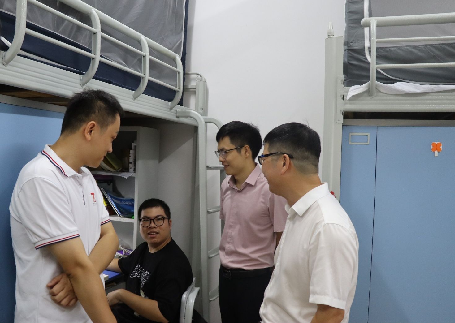 当日下午16点,学院继续开展新生宿舍慰问走访活动。由党委书记黎先、院长陆汝成、党委副书记莫雅兰、团委书记张慧荣、学院辅导员及各班班主任组成的慰问小组深入新生宿舍,为初入校园的同学们送去关怀与温暖。老师们围绕财产安全与防诈骗进行细致叮嘱,并亲切询问新生是否适应新环境、新室友,耐心解答学业规划、校园服务等方面的问题,同时鼓励同学们珍惜大学时光,做好学业规划,养成良好习惯,加强锻炼,互帮互助,共同营造积极向上的宿舍氛围。