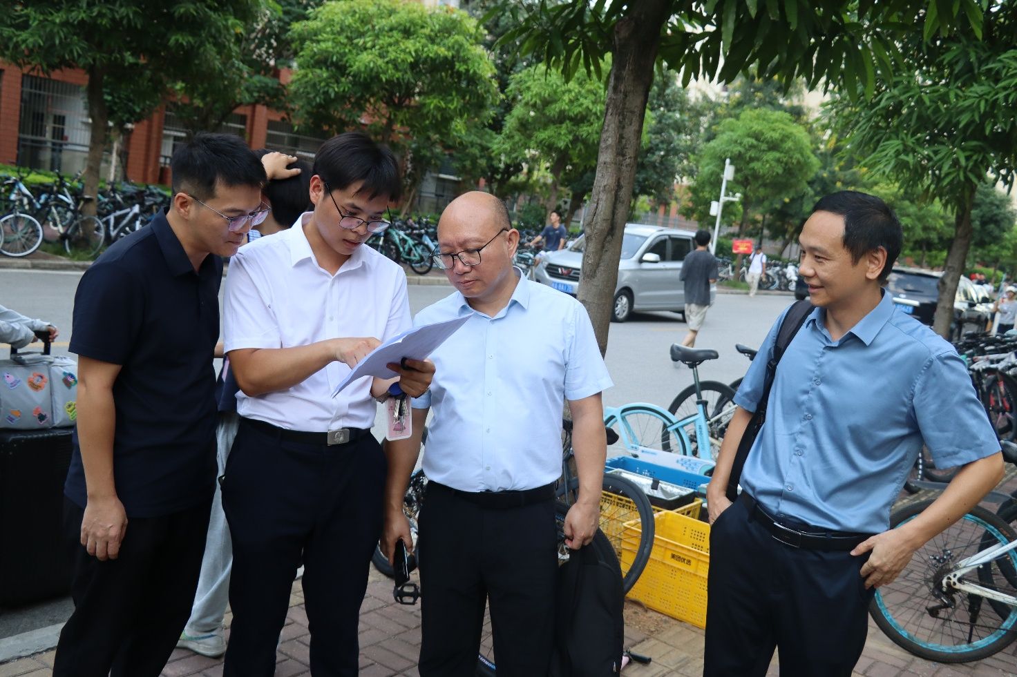 院领导们来到迎新现场,一同慰问一线工作人员,并指导工作开展。迎新现场,团委、学生会的工作人员与新生助班分工明确、无缝衔接。工作人员们守候在各校门,主动帮新生搬运行李,耐心解答各类问题,确保新生顺利抵达报到点。助班们则高效办理入学手续,核对证件、发放物资、指导填写材料,为新生提供专业而温暖的一站式服务。大家通力协作,迎新工作秩序井然、温馨高效。期间,学校领导亲临学院报到区域检查指导,对学院周密的工作安排和师生饱满的热情给予充分肯定。校领导的关怀与鼓励为迎新工作注入了温暖与力量,让整个迎新现场氛围更加热烈、有序。