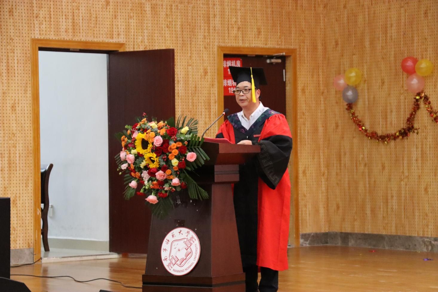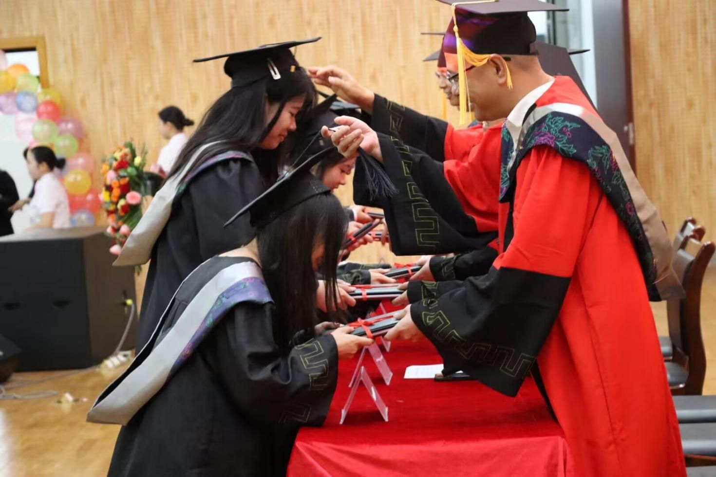 典礼在雄壮的国歌声中拉开帷幕。莫雅兰老师首先介绍了出席典礼的嘉宾,随后院长陆汝成发表了热情洋溢的致辞。陆院长对毕业生们圆满完成学业表示热烈祝贺,并对师生家长的辛勤付出表示感谢。他鼓励毕业生们胸怀家国、终身学习、知行合一,在新时代中建功立业。杨小雄副院长随后宣读了学校2025届学生毕业及学位授予的相关文件。在庄重的仪式中,学院领导及学位评定委员会委员依次为全体毕业生颁发毕业证书和学位证书,并为他们拨穗,象征着他们即将开启新的人生篇章。现场气氛热烈而庄重,每一位毕业生走上台,接过承载着多年努力与梦想的证书,与领导和老师们合影留念,台下的掌声此起彼伏,既是对毕业生们的肯定与祝福,也是对他们未来的期许。
