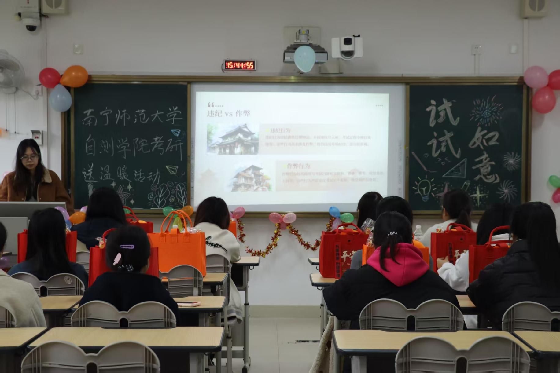 于武鸣校区2号教学楼104教室为正在紧张备考的考研学子组织了一场温馨的送温暖活动及考研诚信教育活动,学院全体辅导员及考研学生代表参与本次活动。